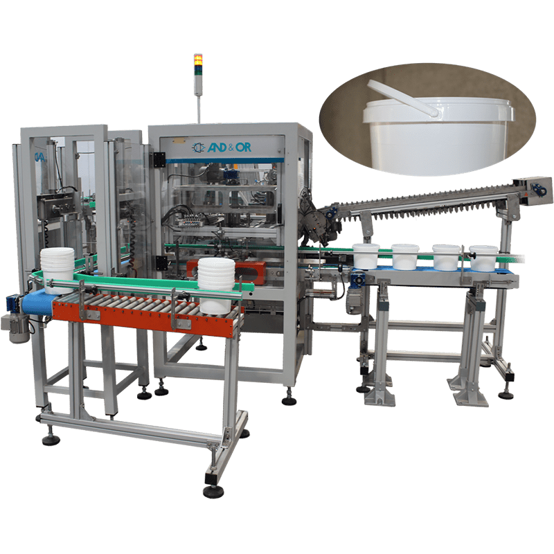 Our handle applicator system on buckets performs the insertion of handles on PET or PE buckets. It is a fully automatic system that allows tumble or pre oriented handles feeding, according to line characteristics.